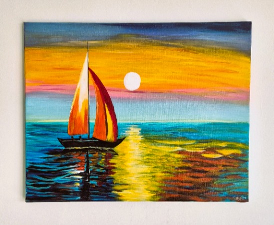 Original acrylic painting on canvas of a sailboat with orange sail on ocean during sunset