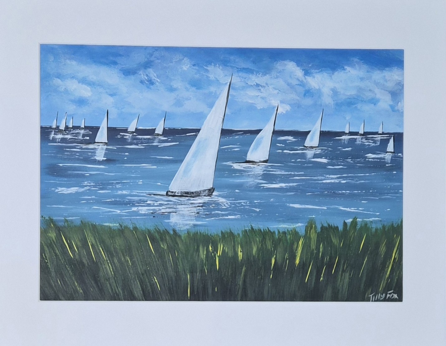 Original acrylic painting of white sailing boats on a calm sea with a green grassy foreground.