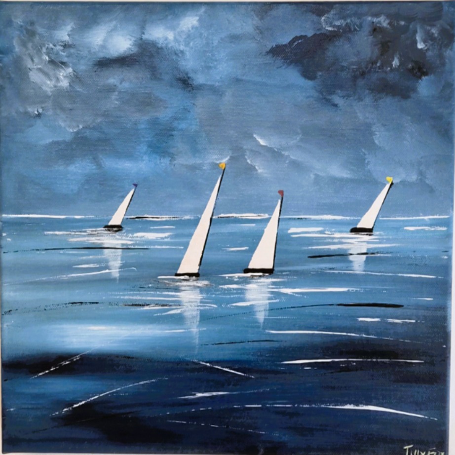 Original of acrylic painting of sailboat racing on a calm sea